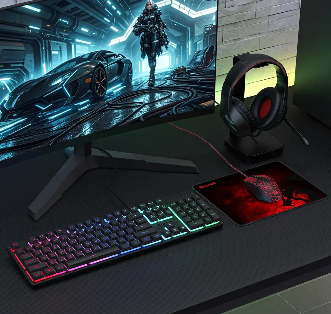 اگر بهدنبال یک ست کامل و هماهنگ برای شروع گیمینگ حرفهای هستید، باندل Redragon Essentials S107P-BA یکی از بهترین انتخابهاست. این مجموعه شامل چهار ابزار اصلی برای گیمرهاست: کیبورد مکانیکی گیمینگ، ماوس دقیق، هدست حرفهای و ماوسپد باکیفیت. تمام اجزای این پکیج با طراحی یکپارچه و نورپردازی RGB، تجربهای منسجم و جذاب برای کاربران فراهم میکنند.