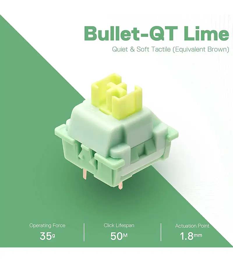 سوئیچ A113 Bullet QT یک سوئیچ Tactile (لمسی) است که قبل از رسیدن کلید به نقطه فعال‌سازی، بازخورد لمسی مشخصی ارائه می‌دهد. این ویژگی باعث می‌شود هر فشار کلید با دقت و کنترل کامل انجام شود، بدون نیاز به پایین کشیدن کامل کلید.