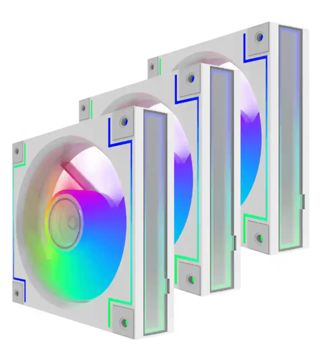 ظاهر سفید و تمیز این فن‌ها، به‌ویژه در کیس‌های با پنل شیشه‌ای، جلوه‌ای لوکس و حرفه‌ای ایجاد می‌کند. پره‌های نیمه‌شفاف و حلقه‌های نورانی دوبل، نورپردازی ARGB ۳ پین (۵ ولت) را به‌صورت یکنواخت پخش می‌کنند و فضای داخلی کیس را با رنگ‌های زنده و متحرک پر می‌سازند.