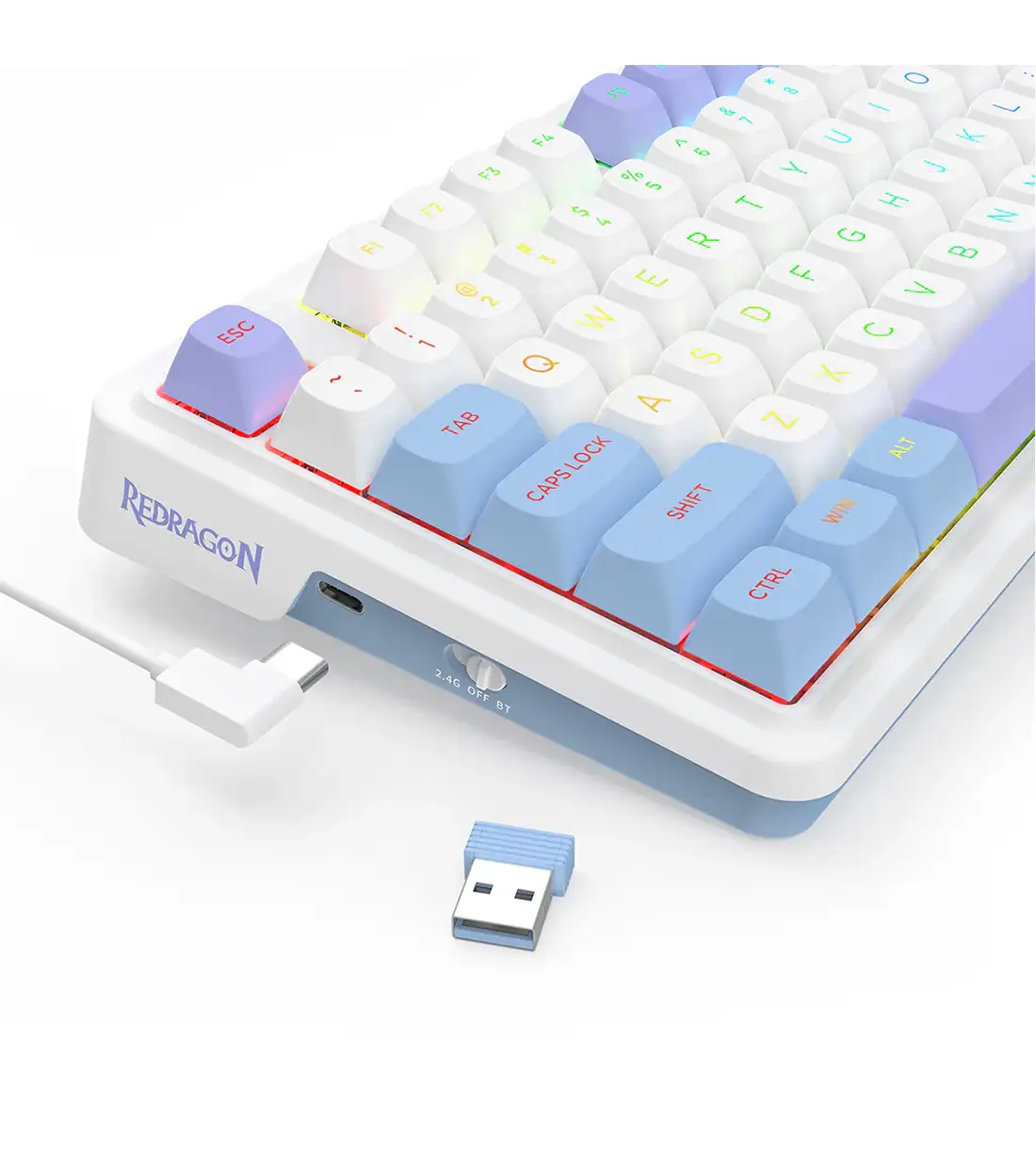 نورپردازی RGB این کیبورد بی سیم مکانیکال گیمینگ ردراگون UCAL MAX K673 WBP یکی از نقاط قوت اصلی آن است. هر کلید دارای نور مستقل است و میتوانید از بین چندین الگوی نوری مختلف یکی را انتخاب کنید. این افکتهای نوری قابل تنظیم هستند و جلوهای مدرن و چشمنواز به میز شما میدهند.