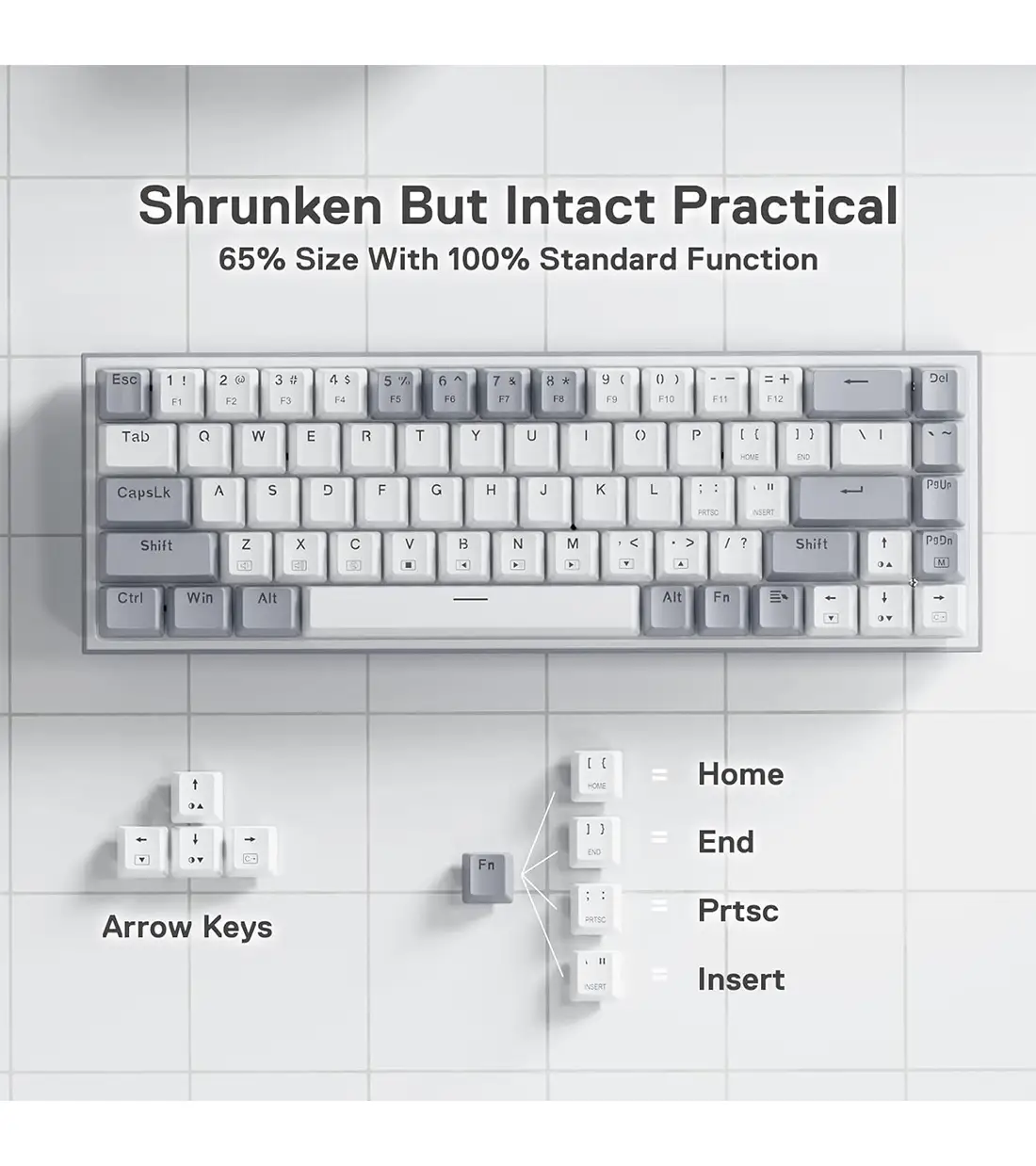 کیبورد مکانیکال گیمینگ ردراگون Castor K631 Grey با ۶۸ کلید طراحی شده است که آن را در دسته کیبوردهای مبتنی بر طراحی ۶۰ درصد قرار می‌دهد. این سبک طراحی برای کاربرانی که فضای میز کوچک دارند یا به ستاپی ساده و مینیمالیستی علاقه‌مند هستند، انتخابی فوق‌العاده است.