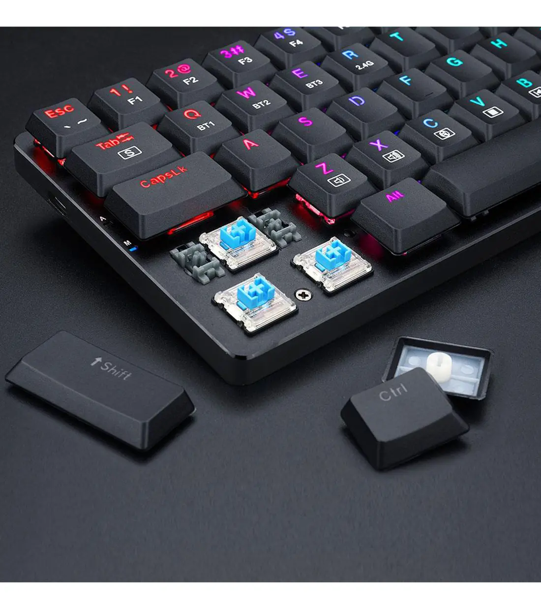 کیبورد ردراگون ASHE Pro K626P-KBS از سوئیچ‌های مکانیکال آبی بهره می‌برد. این سوئیچ‌ها بازخورد لمسی و صدای کلیک مشخصی دارند که برای گیمرهایی که به پاسخ‌دهی واضح کلیدها اهمیت می‌دهند بسیار مناسب است. سوئیچ‌های آبی باعث می‌شوند هر فشار کلید با دقت بالا ثبت شود و تجربه‌ای لذت‌بخش در تایپ و بازی فراهم گردد.